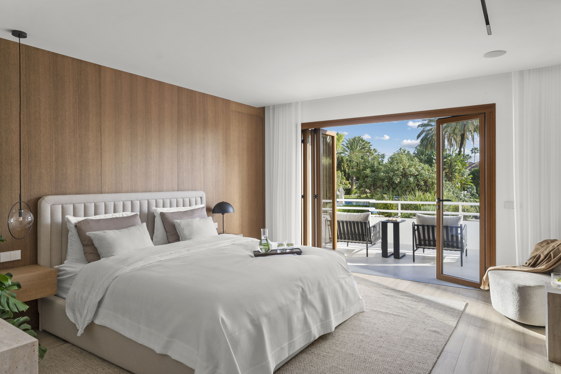 Thoughtfully designed with a sophisticated blend of minimalist luxury and natural elegance, the home exudes a serene and contemporary atmosphere. The main level features a spacious open-plan living area seamlessly integrated with a modern, fully equipped kitchen. Large sliding doors flood the space with natural light and connect directly to generous terraces and a charming private garden, creating the perfect environment for outdoor dining, relaxing, and entertaining.
